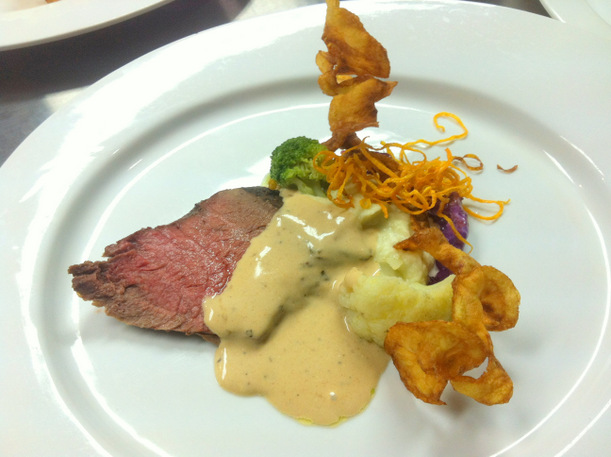 The main course was served and It was delicious Brazilian Beef served with pureed broccoli and cauliflower, red cabbage and cauliflower along with carrot chips! Excellent! It was so good and the beef was moist tender and juicy.