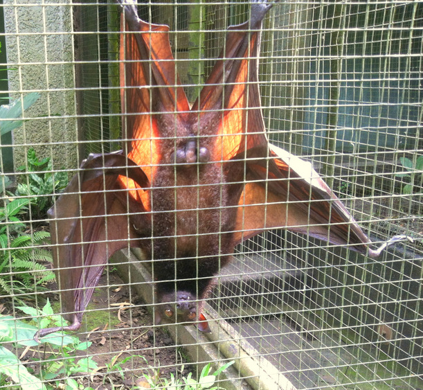 We turned a corner and what appeared to be a brown sack in a cage. The brown sack unrolled and crawled across the cage bars looking at us! It was a very curious and friendly flying fox!