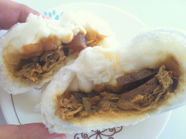 I tried the bola bola siopao. It tasted ok. There was a lot of stringy stuff and there were chunks of veggie meat in it. It tasted like meat but not quite like meat. The texture is interesting. The veggie meat actually looks like meat and it is even a little pinkish.