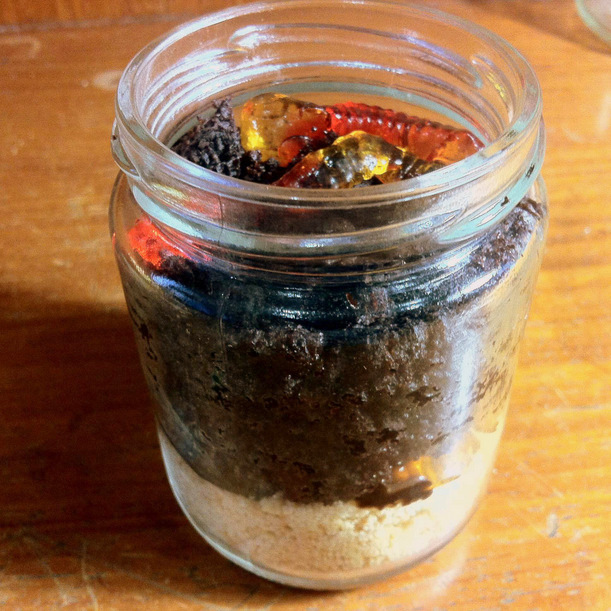 Well, this is a really fun cake. It looks like dirt and the gummy worms are a very nice touch. Perfect for kids! There is a second bottom layer that is made of crushed shortbread cookies. It is a welcome change of texture from the chocolate cake. A second worm was found lurking in this layer. Really nice!