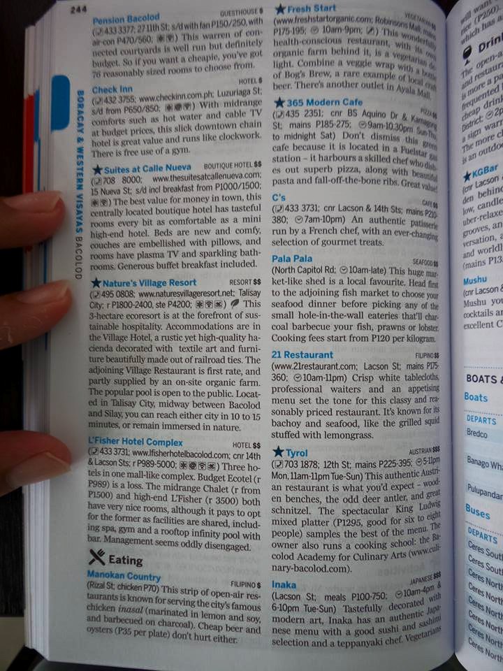 Well, that’s it for the top three restaurants in Bacolod according to the 2015 edition of lonely planet. There are more restaurants in the guidebook! This picture I took shows the restaurants that were highly recommended. The choices are surprising! Even mainstays like Bob’s and Calea are not mentioned as well as a certain restaurant that claims its the best in Bacolod.