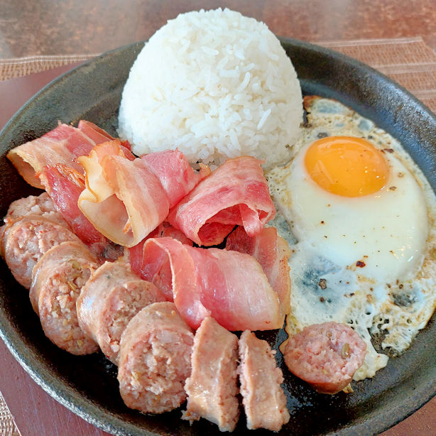 Capriccioso Deli Ristorante serves their sausages Filipino breakfast style – with rice and an egg. You can customize your breakfast by adding on more sausages, egg or rice. Here’s our breakfast dish of sausages, bacon and egg!