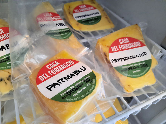 Real authentic Mozzarella is white in color and firm to the touch. Casa Del Formaggio stores its mozzarella in pouches filled with brine to preserve the mozzarella cheese. The words “Fior de Latte” on the packaging means that the mozzarella is made from fresh pasteurized milk. We bought a pouch to take home and the mozzarella was in a round compact ball with a springy, rubbery texture. Melted down, it became soft and easy to spread!