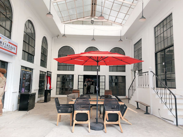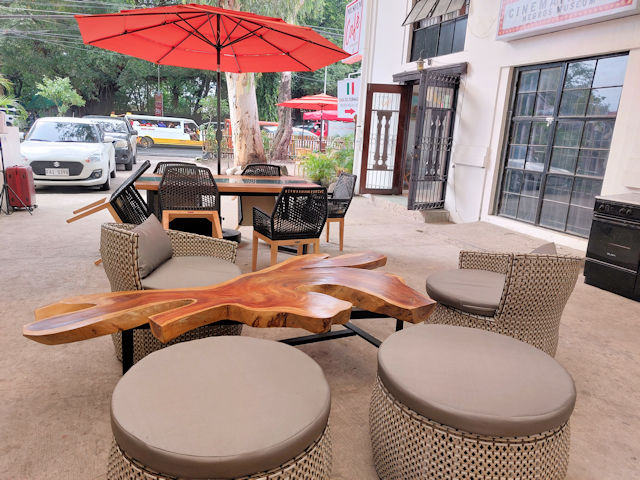 You can dine in the central area where there is a large atrium. The tables underneath are made of gorgeous tree trunk cross sections!