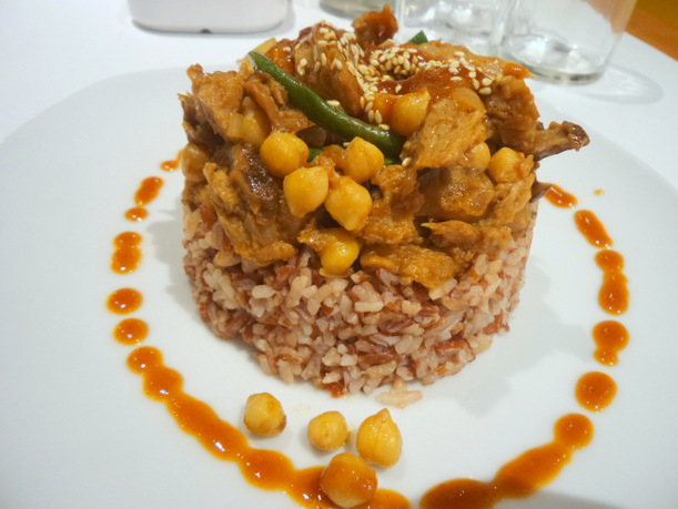 Bulgogi is a dish consisting of grilled marinated meat. Vedge health Hub’s Veggie Bulgogi takes chunks of meaty-tasting vegetable protein, chickpeas and beans and serves it with a sweetish barbecue sauce on top of red rice. We recommend this dish as well to people who want to try something new but at the same time still experience a familiar taste.
