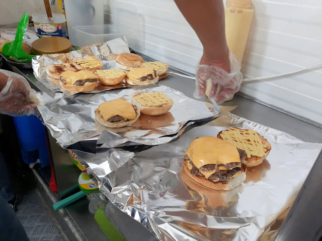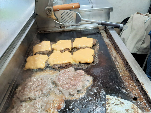 The staff cooks the burgers on a grill and then when the burgers are done the burgers are covered with a slice of premium cheese. The burgers look and smell so good!