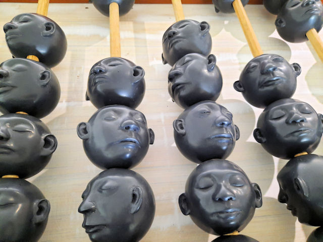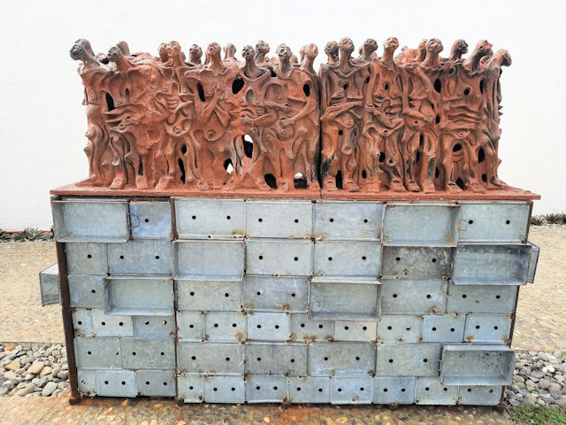 We’re always thinking about food so we thought the metal trays look like pans for making leche flan. On top of these trays is a terra cotta sculpture of emaciated bodies.