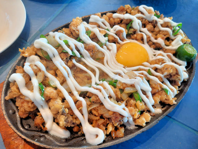 First to arrive was the Krispy Sizzling Pusit made with breaded fried squid and served on a sizzling plate topped with an egg, green chilis, and a creamy mayo sauce. Quite good! We love Calamari and this is a new and interesting way to try our favourite dish!