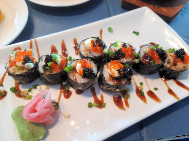 The Spicy Salmon roll was a roll of sushi that was deep fried so it had a crispy coating. It was topped with two kinds of fish roe and it came drizzled with a sweet sauce and a pink, pickled ginger rose. Quite good although we wished that there would have been a lot more salmon.
