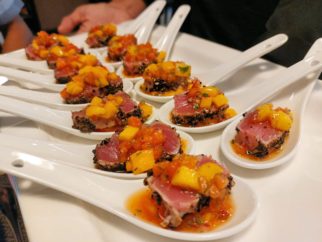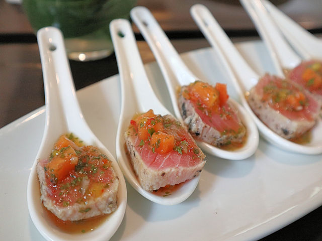 Pan-Seared Tuna with mango and papaya salsa in Chinese spoons