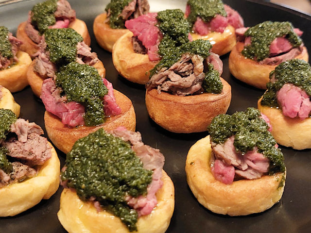 Roast beef with salsa verde on mini Yorkshire puddings
