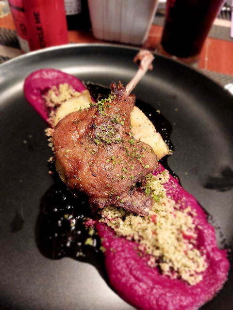 This dish combines savory duck with couscous grains, smashed potatoes, and a mild sweetness from the beetroot puree. Tying this all together is the zesty