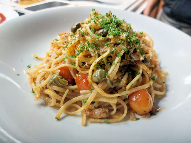 Blue Crab Linguini with chili, capers, and parsley