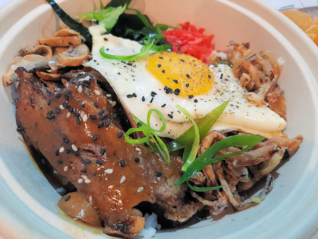 The roast beef loco moco is absolutely decadent. Slices of roast beef with a delicious, rich gravy.