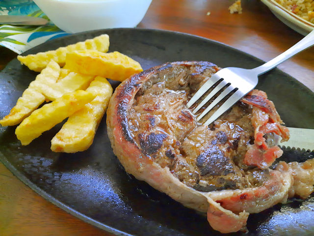 Filet Mignon or beef tenderloin also makes an appearance at Casa Blanca Restaurant Bacolod’s menu. A cut of marinated beef tenderloin is wrapped with strips of bacon and served with fries and a mushroom gravy.