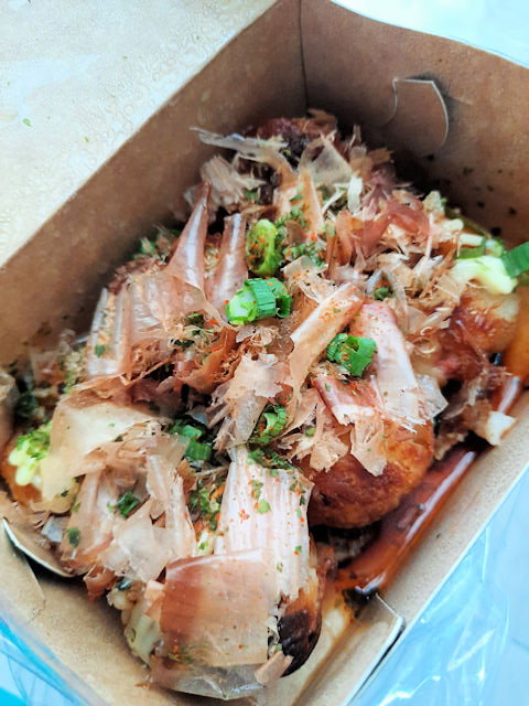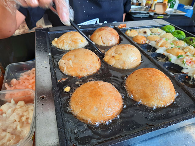 Takoyaki is a Japanese street food that consists of a fried batter ball. It is usually stuffed with octopus and sauce is poured over it. Some additional stuff like dried bonito flakes, seaweed and seasonings are added.