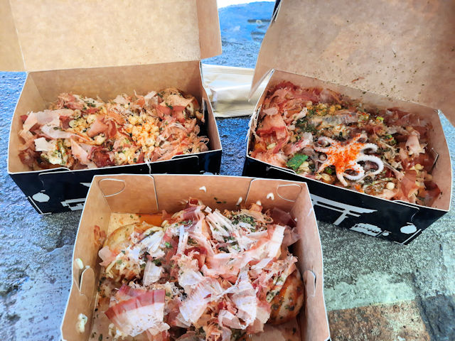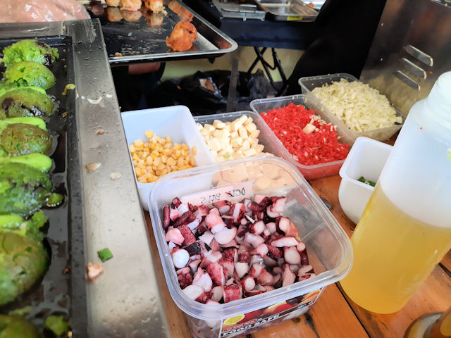 your suggestion to simply order the cheapest viand/seafood item makes sense; I’ve found that a good number of food purveyors tend to skimp on the ‘protein volume’ be it scallop, shrimp,or octopus or whatever. One such place (nearby) makes Mongolian ricebowls and while they’re satisfying and filling, there’s no appreciable difference between their beef or chicken or pork because the sauces are so overpowering. It would seem the same here. I’ll try them sometime, but if they’re running an electric grill, I think I’ll give them a pass.