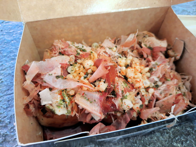 The Takoyaki looks great! There were several kinds being cooked. This picture shows their default Takoyaki flavor. There’s plenty of things being stuffed into the Takoyaki! The menu says that there’s benishouga (pickled red ginger) octopus, tempura flakes and spring onion in each takoyaki ball.