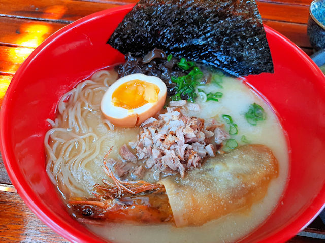 Overall this is quite good Ramen. The price is affordable and the ramen is surprisingly tasty. We particularly liked the Shrimp “lumpia”. The head and the tail are just there for decoration but the middle is a delicious shrimp roll. Highly recommended.