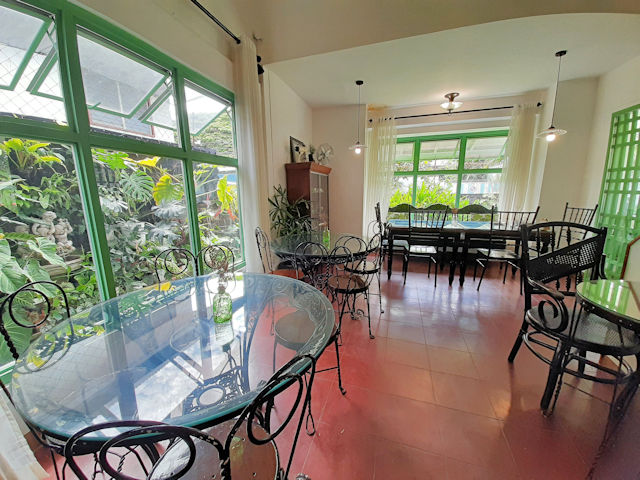 There’s a large dining table right beside the entrance to Tiffany’s Confections. This spot has a nice view of the gazebo and the garden. Notice anything different? This table is super unique as it is made from a door! They just placed a plate of thick glass on it. Very creative and very remarkable! There’s also a curio cabinet right beside the table where you can see the owner’s collection of curios and knick-knacks.