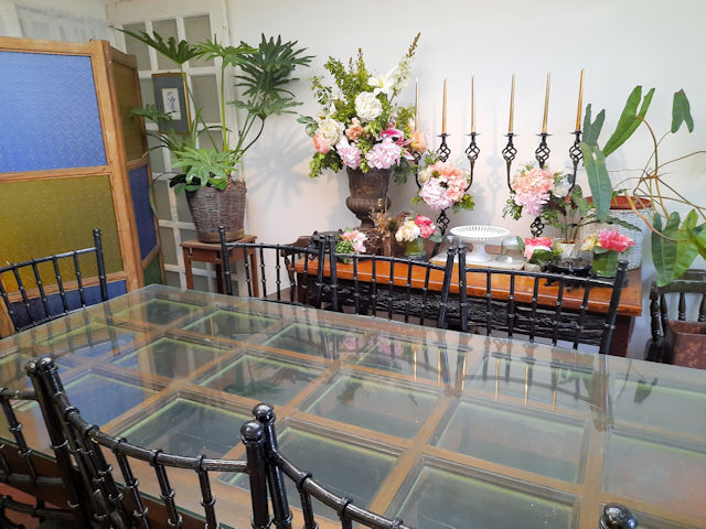 The farthest table is another big one with its own personal view of the garden, a skylight to let in plenty of light, and a small side table with decorations.