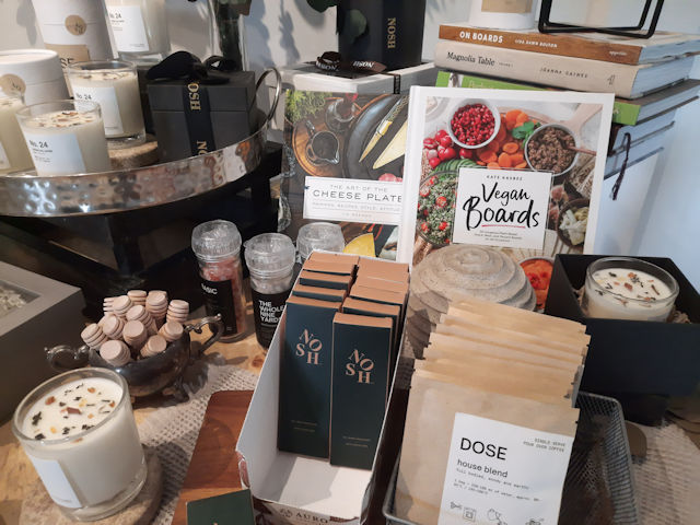 The table is filled with products from nosh! They have Dark Chocolate Bars 67%, Their own coffee blend and cute soy candles that smell so good!