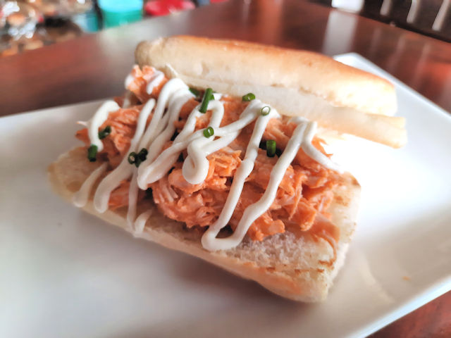 We love chicken sandwiches so we had to try Nosh Deli’s Buffalo Not Wings. It’s a spicy take on a chicken salad sandwich. There’s buffalo sauce and a blue cheese sauce.