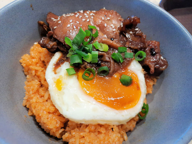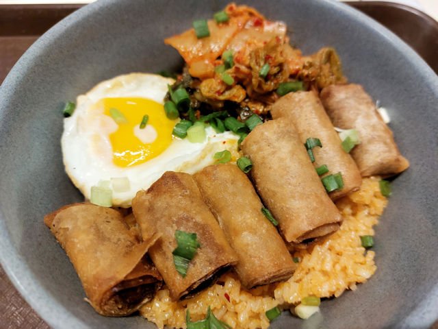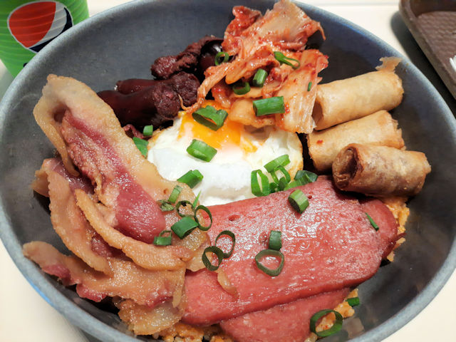 Our absolute favorite Ricebowl at Chigue House of Kimchi is the Superbowl. It has everything on it! It has bacon, Spam, Longanisa, Lumpia shanghai and an egg. It is a super duper good meal. Order this!
