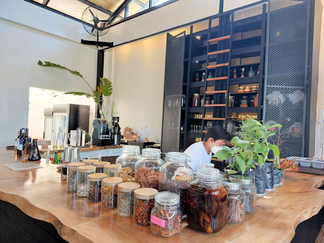 On the counter are these eye-catching bottles of craft Gin and Vodka from local producers in the Philippines. The drinks and cocktails of Lanai were created by chef, Kalel Demetrio who uses local herbs, plants and alcohol to create spectacular drinks!