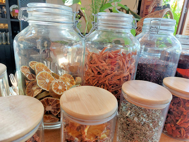Lanai by Fresh Start’s bar has a great “natural organic” look. It looks like a herbalist or wizards shop with the many glass jars filled with dried plants, fruits and bark. Very interesting and eye catching! Definitely a conversation starter with your guests.