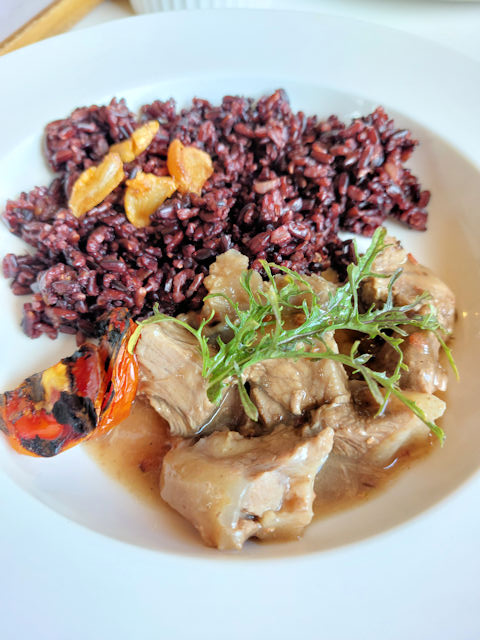 For our main dish we tried Lanai by Fresh Start’s Beef Kansi A la pobre. It’s chunks of beef braised in a kansi sauce and served with brown rice topped with a garlic olive oil confit. I found the serving size of beef to be a bit small.. maybe a little more beef would make this a little heartier.