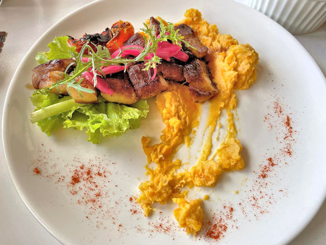 The next dish on Lanai by Fresh Start’s menu that we tried was their grilled pork belly with muscovado guava sauce and sweet camote mash. It’s a pretty dish and it comes with a small side of salad.