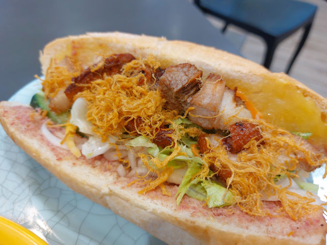We ordered three Bánh Mìfrom Xin Chào to try. The first Bánh Mì was the roast pork Bánh Mì vietnamese sandwich. It’s our favorite sandwich. It came spread with egg butter, meat paste and it had plenty of vegetables and pork floss!