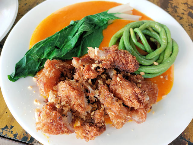 Peanut sauce, breaded and fried pork and veggies! Add a nice dollop of shrimp paste (bagoong) and you’re set!