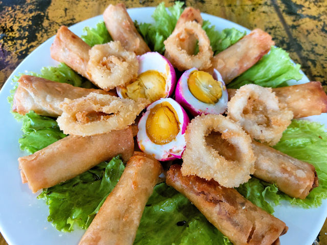 Fried spring rolls and we added squid (calamares) rings and salted egg. Tasty!