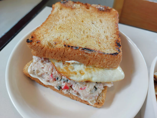 Jinky’s Crabmeat sandwich with furikake came with some jalapenos mixed in. Surprisingly flavorful. We don’t usually like crab but this is the only tasty crabmeat sandwich in Bacolod.