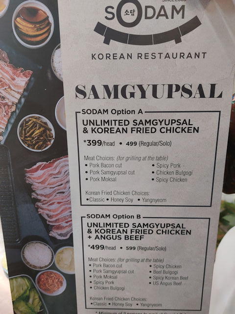 This is the menu at Sodam The Kimchi! There’s Pork Bacon, Pork Samgyupsal, Pork Moksal (neck), Spicy pork, Chicken Bulgogi, spicy Chicken, Beef Bulgogi, Spicy Korean Beef and US Angus Beef.