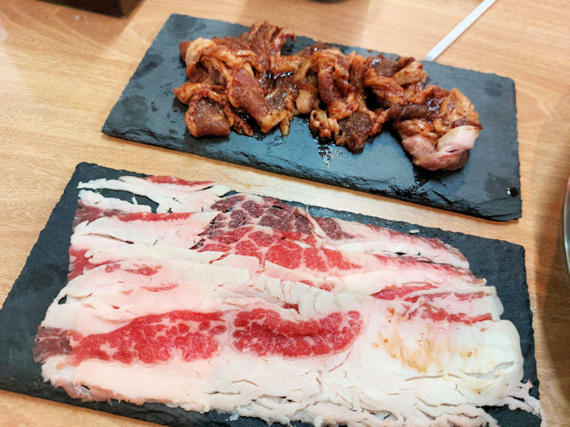 Time to try the U.S. Angus beef and Pork Moksal. They’re very thin slices of meat and they cook pretty fast. We can easily put away a lot of thin beef slices! They’re so good.