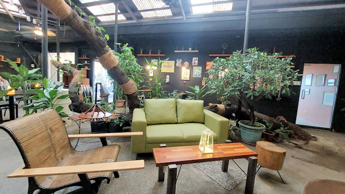 This “foresty” corner is the highlight of Bogs Brew HQ. Lush plants give this area the appearance of being in a rainforest!