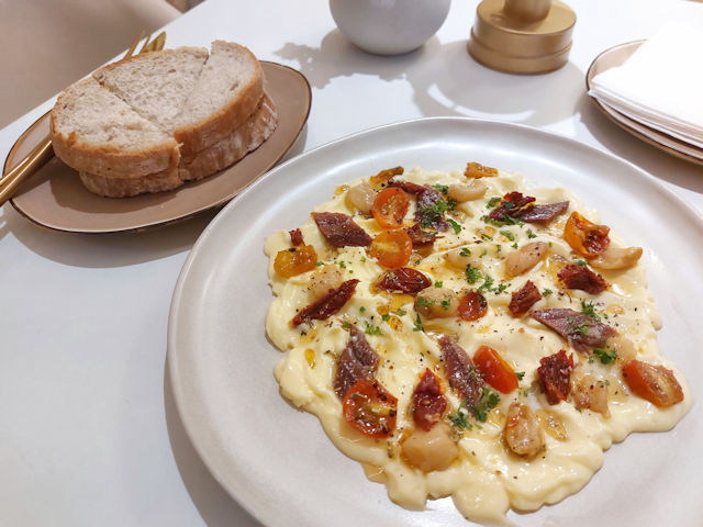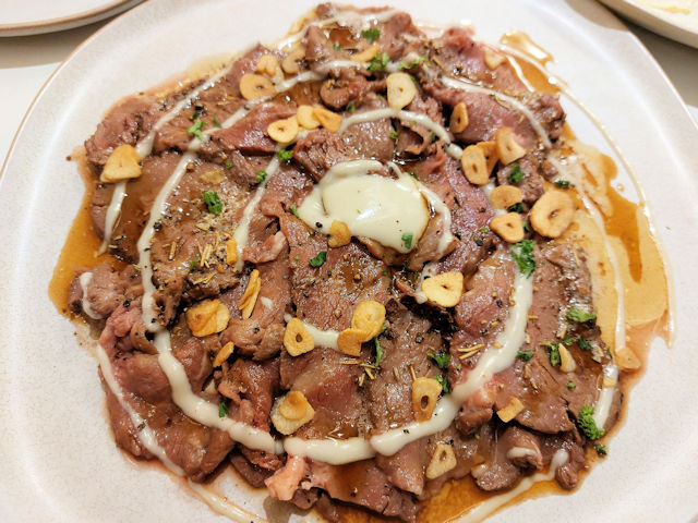 We were recommended this main dish – torched beef carpaccio. It’s Beef Tenderloin, seared and sliced thin with garlic herb butter. We ate this with the excellent breads found at the pastry area of the shop.