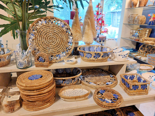 The main entrance of The Handmade Gallery is gorgeous! All of these tiles and ceramic shells are made by workers at Artisana Island Crafts. This gives the entrance a nice Greek or nautical look