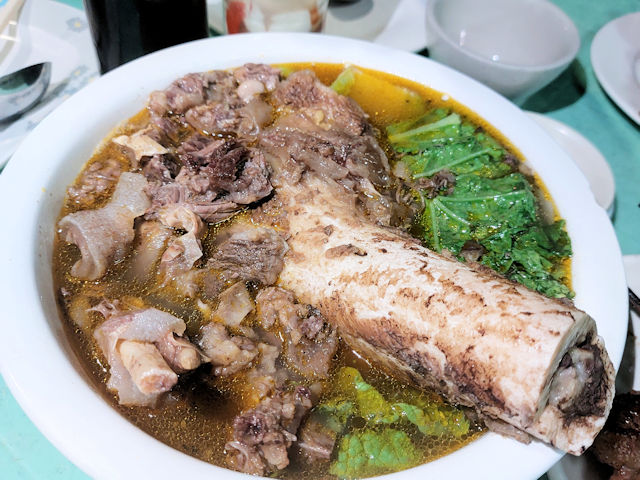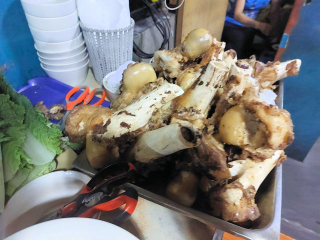 The bones are what makes the soup stock so awesome. They’re boiled and the stock from the bones is used to make the soup. The meat is cut off the bones and portioned out to every order.