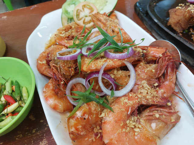 The prawns are fried in butter and are served similarly with plenty of fried garlic