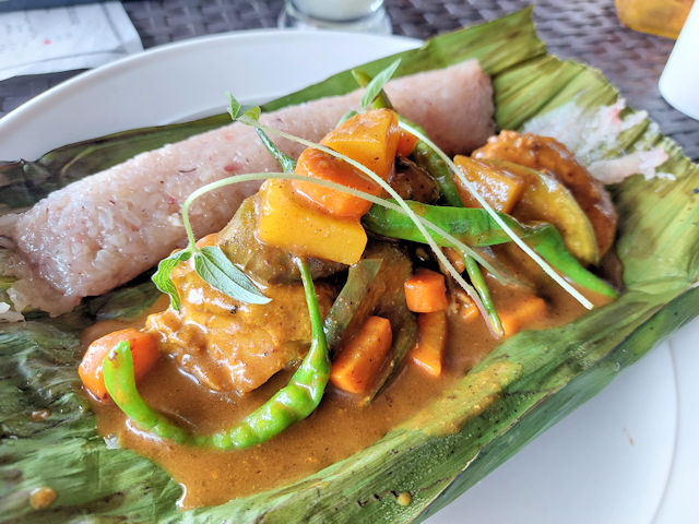 We ordered the Chicken Curry Budbud. It is an asian chicken curry with assorted vegetables and shoots with a side of sticky rice cake (budbud) and all served on a banana leaf.