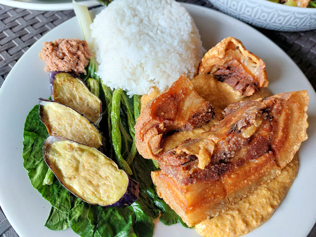 Kusinata’s version serves a massive hunk of deep fried pork on top of a bed of peanut sauce, eggplants, and vegetables. To add a bit of taste is a dollop of bagoong or shrimp paste.