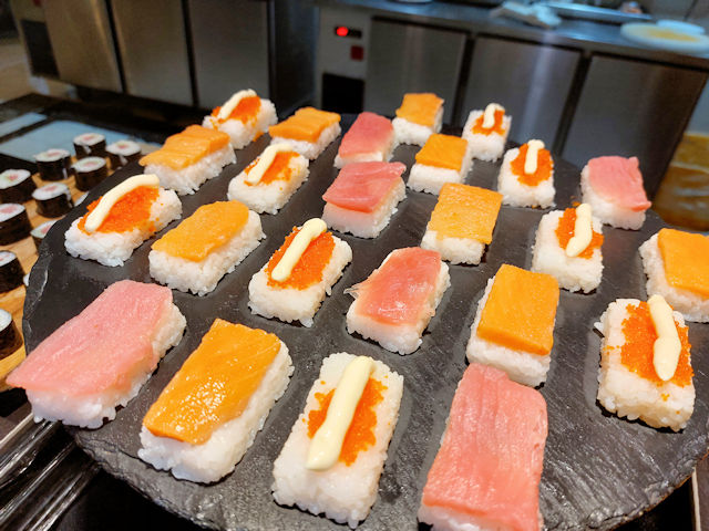 There’s a sushi section right beside the tempura area. This section displays salmon, tuna and crab roe maguro sushi.