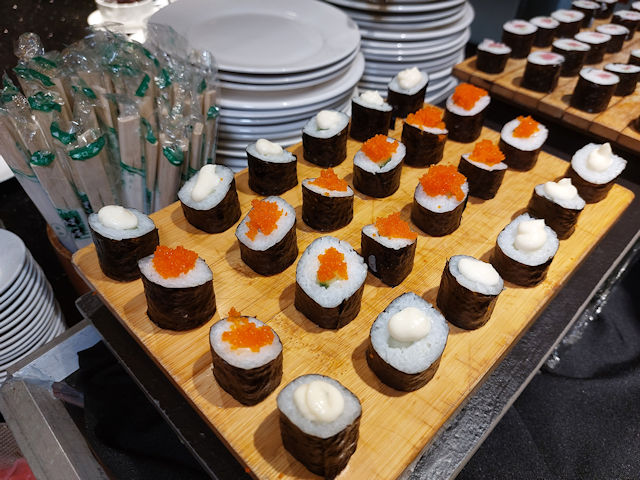 There’s also cucumber sushi rolls and tuna rolls. The rolls are topped with a dollop of mayonnaise or a smear of crab eggs.