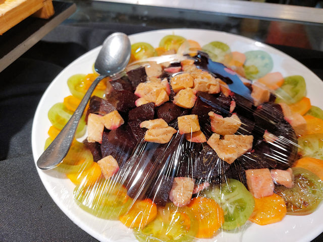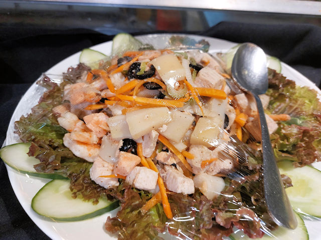 There are also salads on display. They were shrink-wrapped when we took this picture, as they dry out quite quickly. The wrapping was removed when the buffet started.