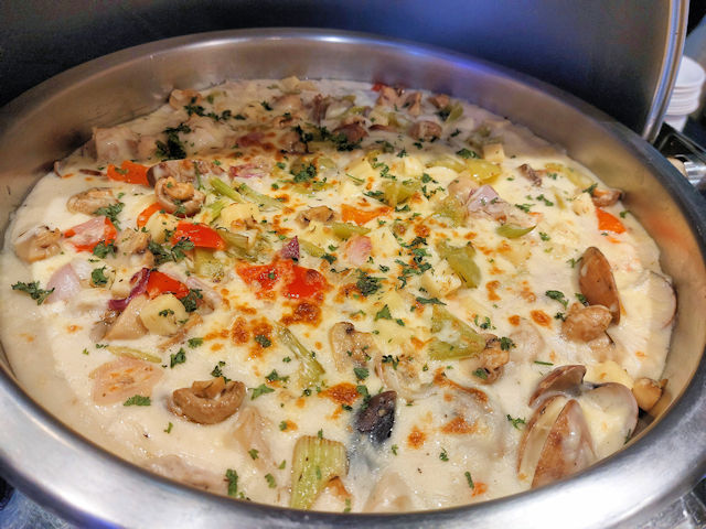 Seafood Thermidor is a creamy seafood dish popular in France. L’Fisher Hotel buffet had a delicious seafood Thermidor with plenty of clams, mushrooms, fish and vegetables.