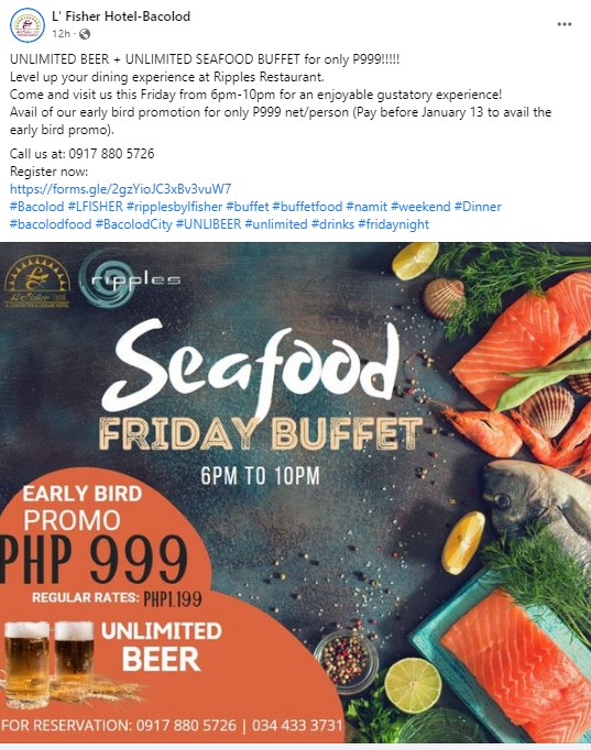 Visit their official Facebook page located at https://www.facebook.com/LfisherHotel for updates and a sign up sheet. You can also call them to make a reservation at 09178805726 or 034 433 3731